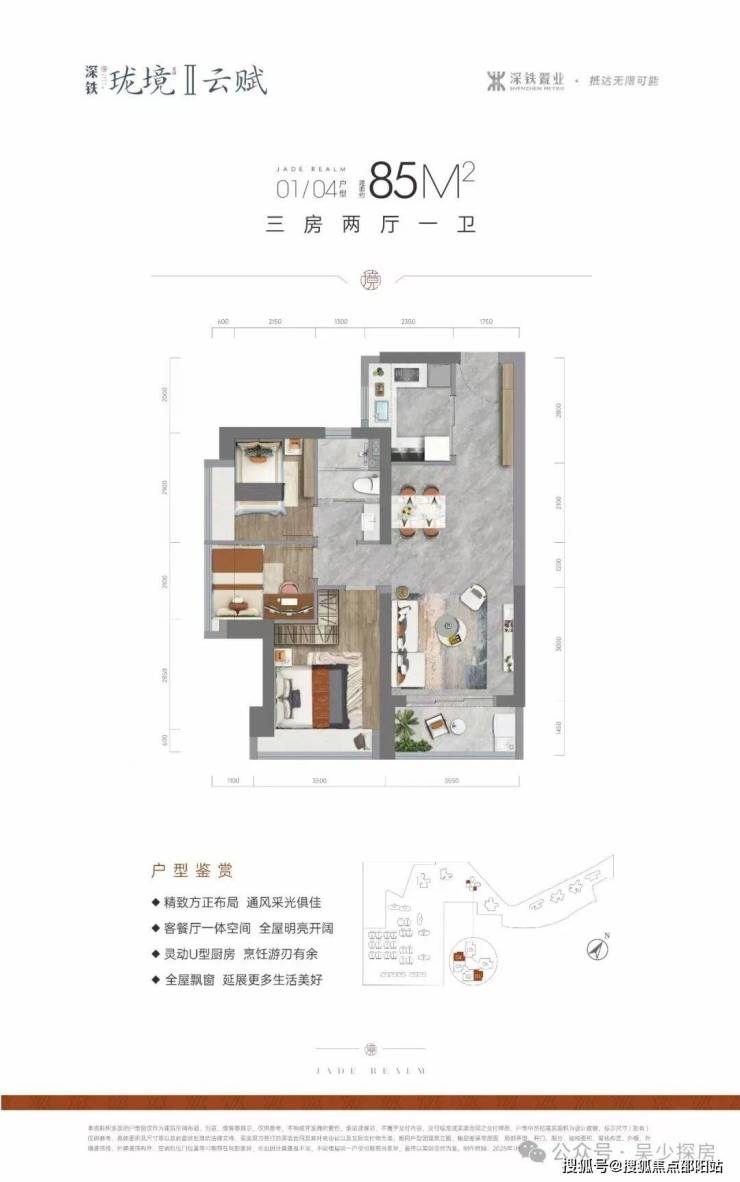 85㎡的3房2厅1卫:设计的是竖厅格局,进门入户玄关,客厅3.6米开间,LDKB一体化设计,动静分区,U型厨房,卫生间三段式分离,得房率约75.4%(不含赠送),西南或东南朝向。