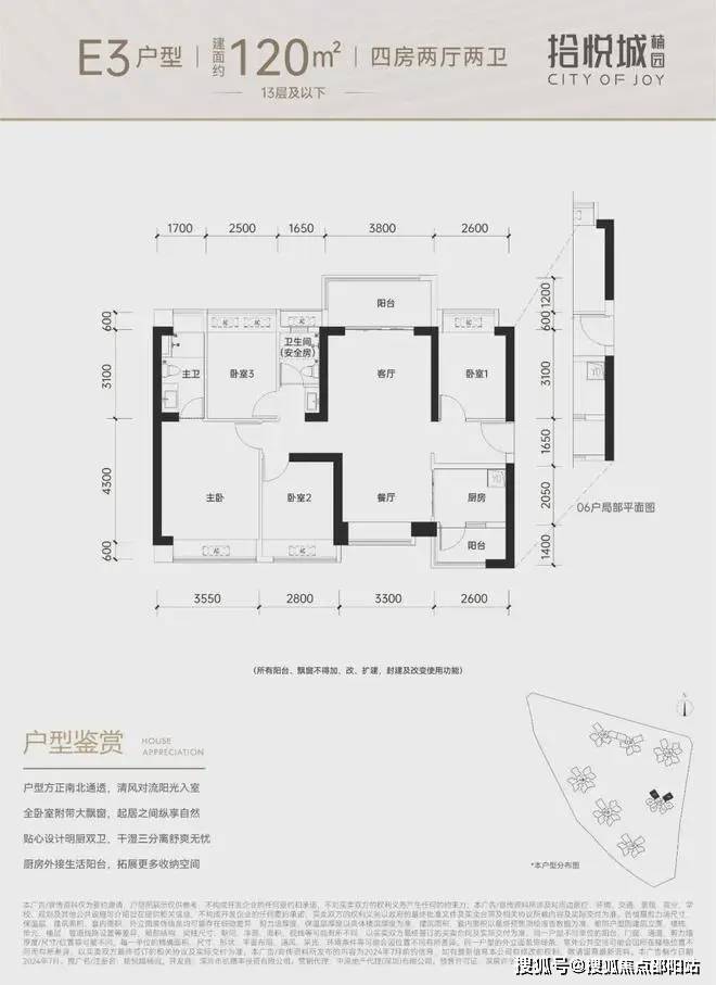 120平-140平,设计的是横厅南北通透格局,进门入户玄关,客餐厅6.3米开间,无过道设计,4个卧室分别做到了3.55米/3米/3米/2.8米的宽度,U型厨房,公卫三段式分离,得房率:74.31%(不含赠送),阳台1.8米宽度,主朝西南或东南向。