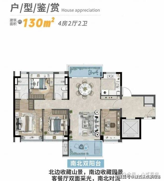 建面130平四房两卫,南北对流,LDKB一体化设计,北望园林,南望300米无敌山景,6米长阳台,独立入户花园