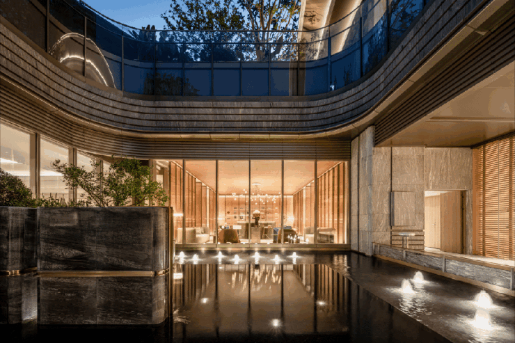 前庭门楼已大美呈现,流畅曲线勾勒檐顶,璀璨星空顶搭配奢石墙面和地面,名贵黑松迎于门前,大宅气派和归家仪式感呼之欲出。