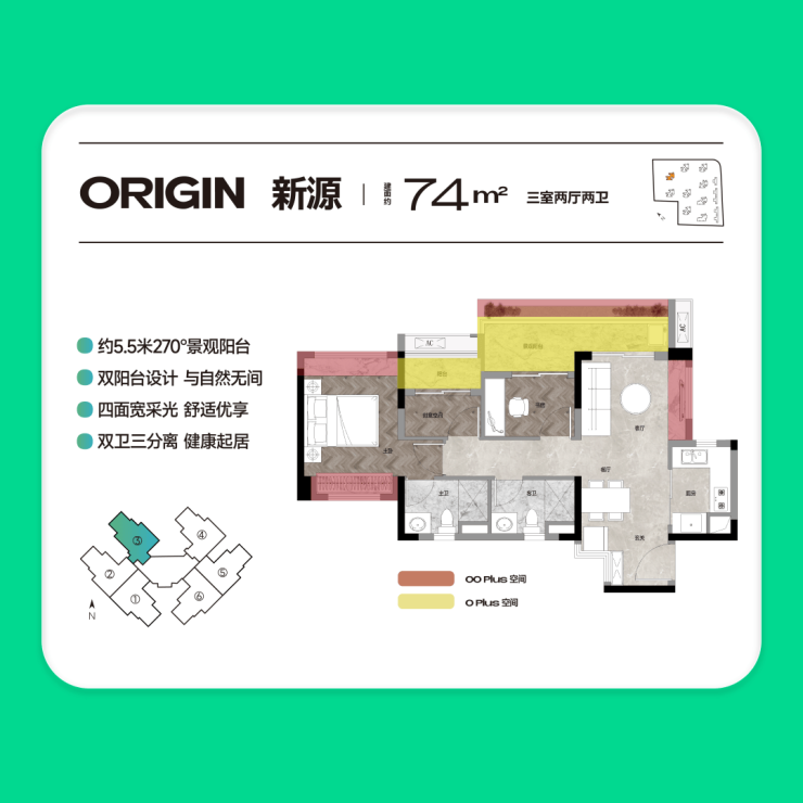 【户型卷】74㎡三房两卫,约5.5米阳台❗
