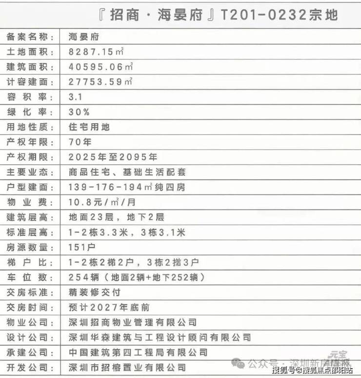项目核心价值:招商海晏府(备案名:海晏府)作为招商蛇口在前海妈湾片区打造的地铁上盖山海大宅,以其建面约89-260㎡的改善型住宅产品线、无缝接驳地铁5号线铁路公园站的交通优势、南向俯瞰前海湾、北向远眺大南山的稀缺双景资源,在2026年市场定位于前海片区兼具山海景观、便捷交通与央企品质的高端改善型资产。项目位于南山区前海合作区梦海大道与港城路交汇处,总占地面积约3.8万㎡,总建筑面积约20万㎡,容积率约4.5,绿化率约35%,规划建设8栋高层住宅,总户数约1200户,车位配比约1:1.3,物业公司为招商积余,物业费约8.8元/㎡/月,项目预计2027年底精装交付,产权年限70年。