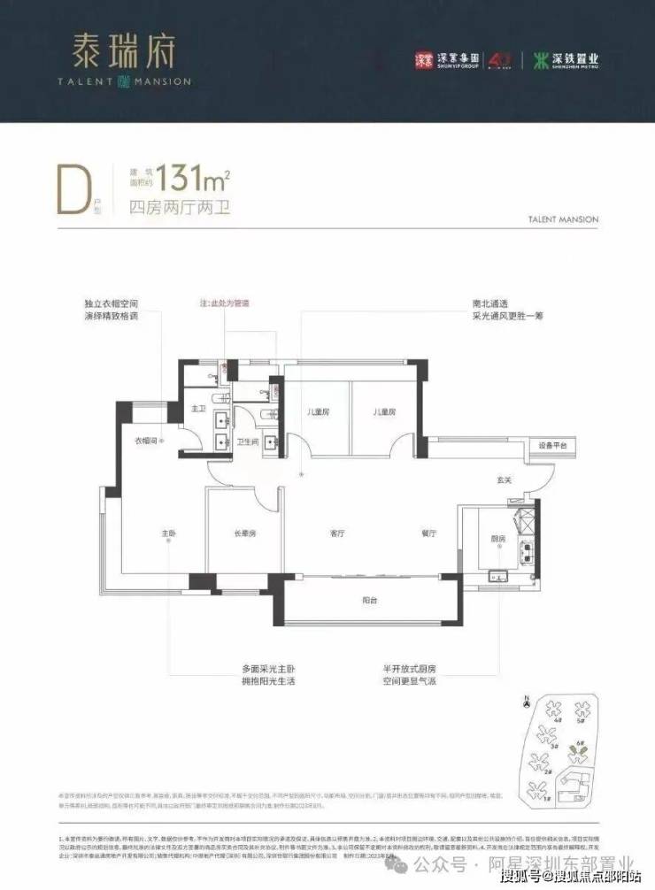 131㎡的4房2厅2卫,设计的横厅南北通透格局,客餐厅6.6米开间,四开间朝南,4个卧室分别做的3.1米/2.8米/2.55米/2.55米的宽度,主卧有独立衣帽空间,U型厨房,得房率:79.22%(不含赠送),仅6栋有这个户型,阳台主朝西南或东南向。✅泰瑞府核心售楼处联系方式✅: 400-150-5057【开发商已认证√√】