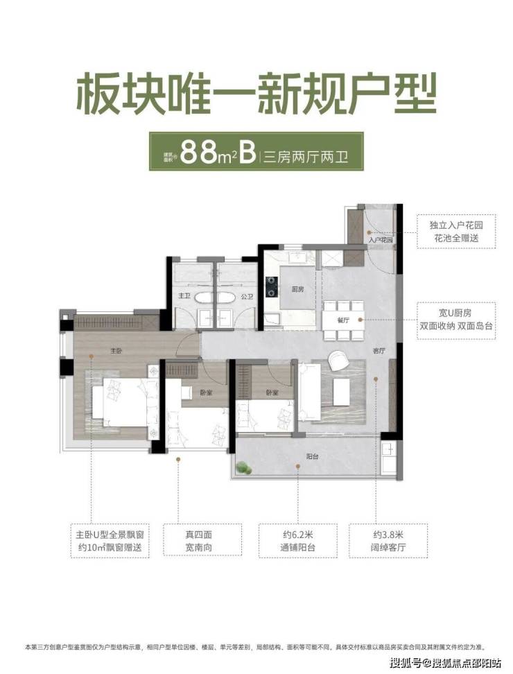 88平B户型,南向三房两厅两卫;