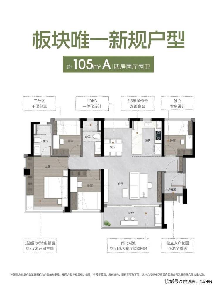 约105㎡户型,四房两厅两卫,南北对流户型,独立入户花园,客厅有约5米大宽厅,LDKB一体化设计,主卧带L型超7米转角飘窗。