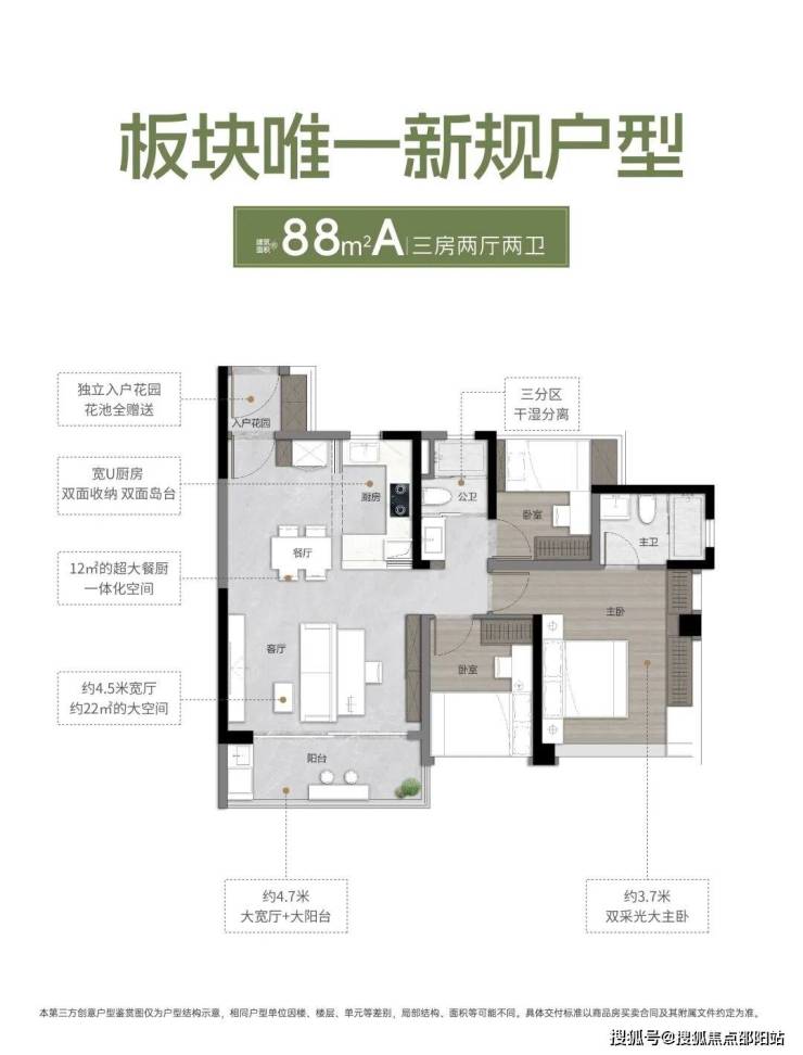 建面约88㎡A户型,三房两厅两卫,有约4.7米大阳台,以及约3.5*4.3米双采光大主卧。