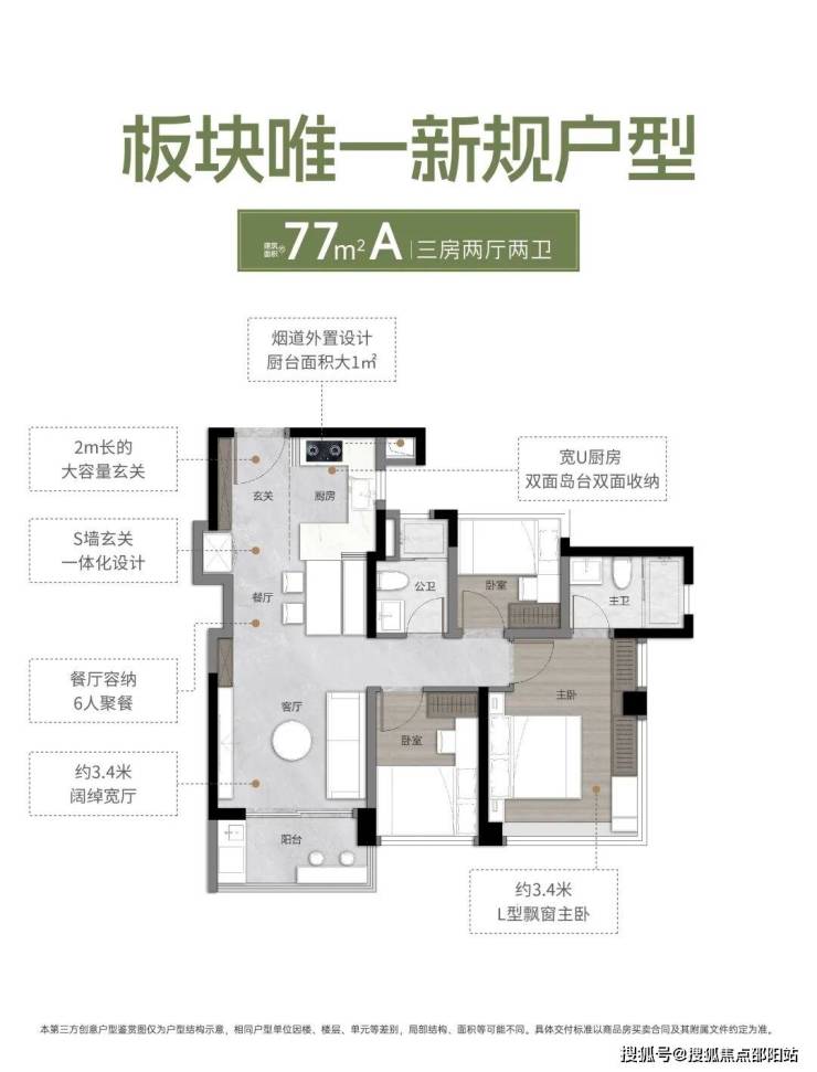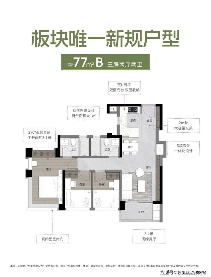 77平A户型,三房两厅两卫;