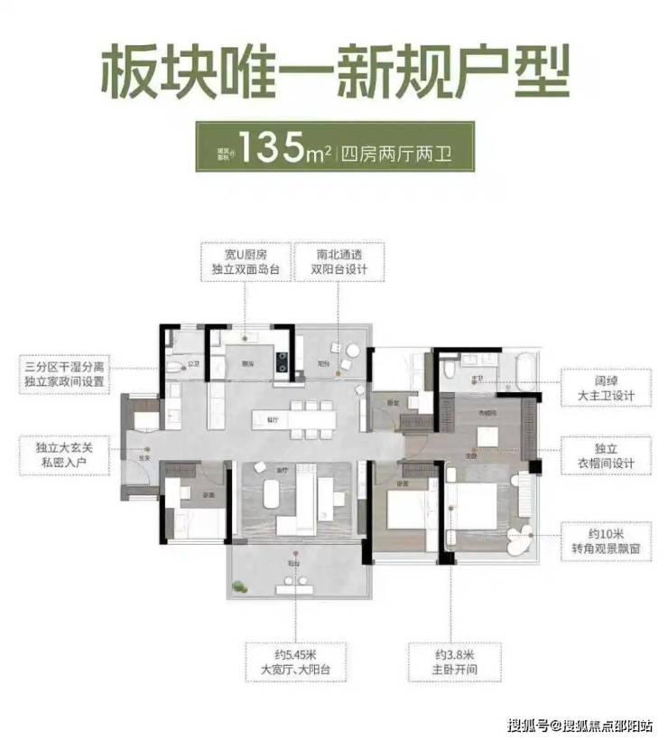 约135㎡户型,四房两厅两卫,南北通透双阳台设计,自带约5.25米大宽厅以及约5.45米大阳台,主卧开间约3.6米,已经快追上不少紧凑三房的客厅开间了!