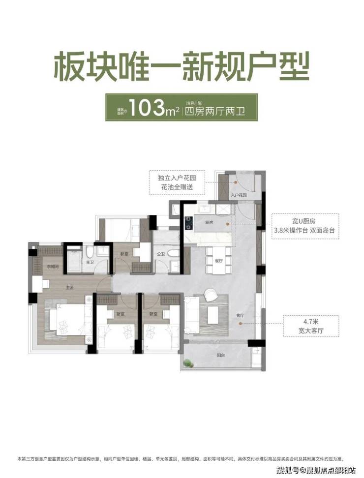 约103㎡户型,四房两厅两卫,独立入户花园,带约7米通铺阳台,270°全景采光大主卧。