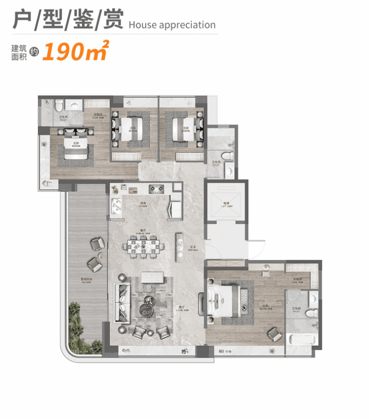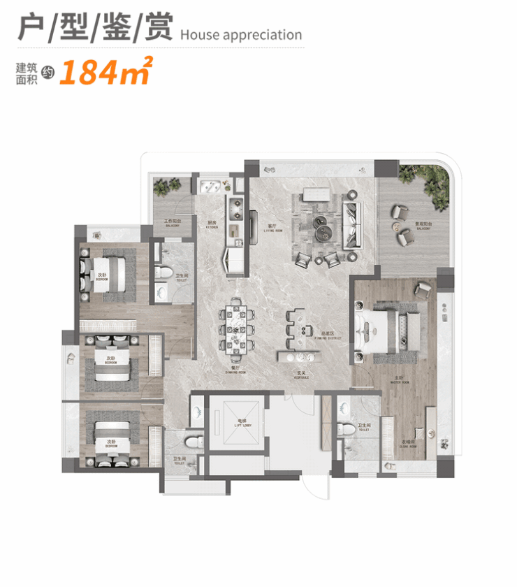 长岭雅居主打大户型住宅,其中约280㎡户型尤为引人注目。此户型拥有面积超过50㎡的双空中观景庭院与超80㎡横厅相连的设计,让住户能够在室内无界享受户外美景。