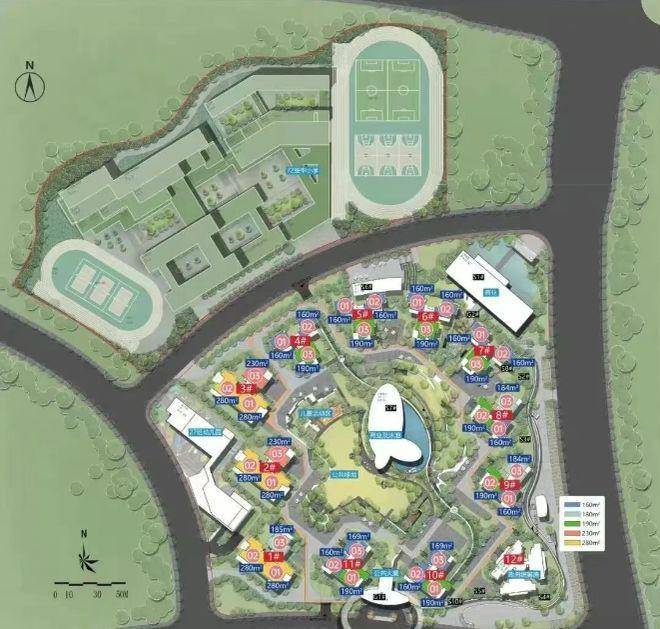 小区内采用唐代画家王维《辋川图》为蓝本打造的中央园林,营造出一种隐奢山居的感觉。园内设有约800㎡的双泳池,提供度假般的体验。项目还保留了地块原生态山地,打造出一个无缝连接内外景色的绿色空间。