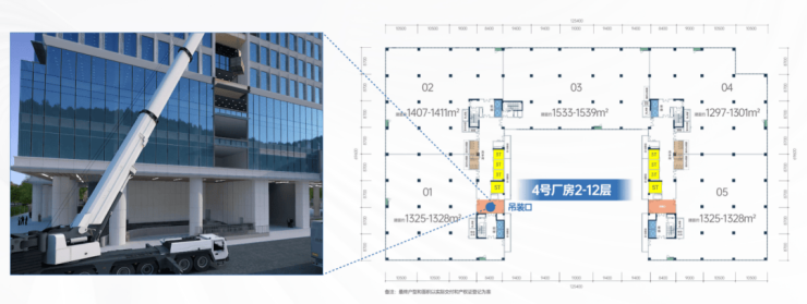 🛗每层配置2个吊装口(首层除外),并在地面预留吊装场地,1.2米卸货平台,可满足35吨吊车(车+装载货物),解决大尺寸、大重物产品电梯运输问题