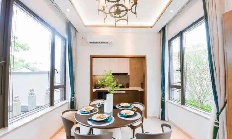 厨房与餐厅一体化设计,庭室全明,优化房间通透性与采光,最大化将院落风景与室内空间进行融合,引入院落处处芳菲。