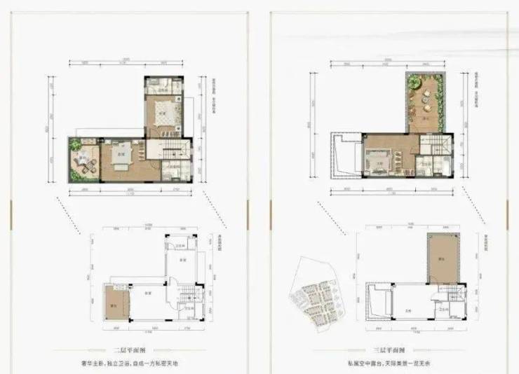 二、三层为舒适休息区,含三个卧室,两层分布,彰显三代同堂、长幼有序的居住礼仪,让居者生活空间更加独立。