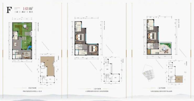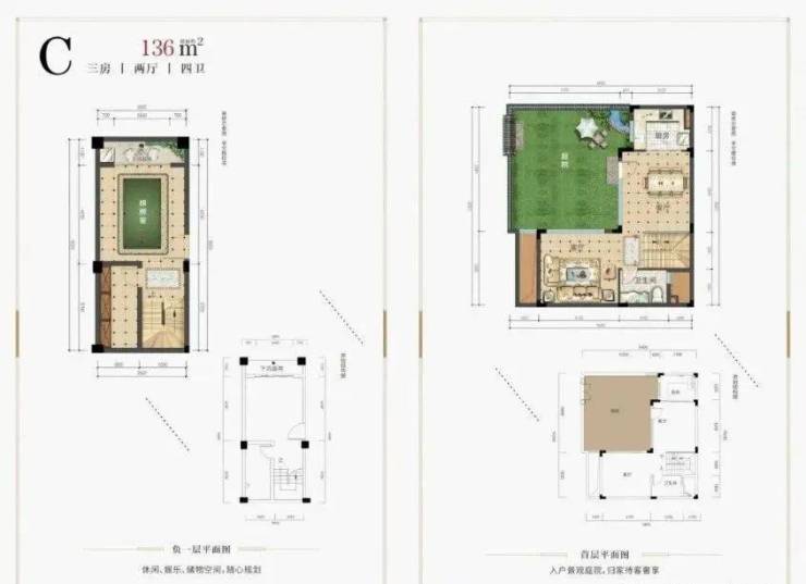 136㎡合院C户型的户内庭院面积近60㎡,饱览天地的主庭院、一角风韵的下沉式庭院、情景交融的超大露台……各有情致,趣意盎然。
