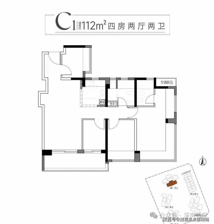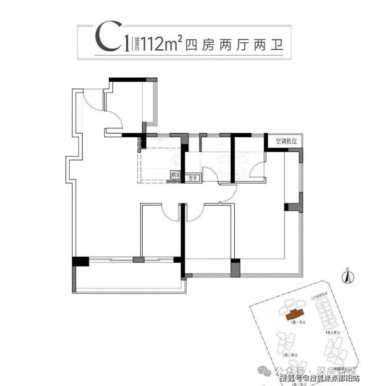 112㎡ 4房2厅C1户型为竖厅设计,大阳台连通到次卧,主卧270度大飘窗,使用率高