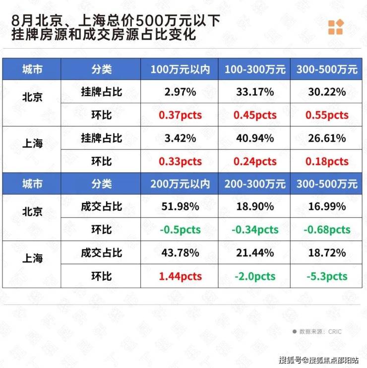 而对应该总价段成交端占比变化却在大幅下滑,北京300-400万成交环比下降了0.96个百分点,总价400-500万成交略有上升。