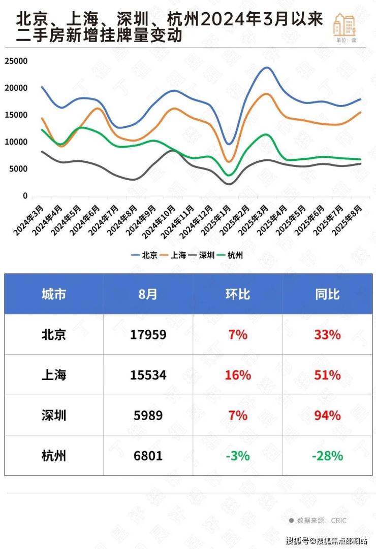 从CRIC监测的北京、上海、深圳、杭州四城新增挂牌套数来看,8月四城挂牌量季节性回升,但四大城市的二手房市场正在经历一场深刻的“信心分化”。