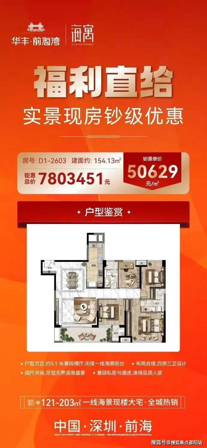 产品覆盖刚需至改善,主力为 121-203㎡精装现楼公寓(70 年产权)。121㎡三房方正通透,2.4 米阔景阳台;154㎡四房横厅设计,6.8 米开间采光极佳;203㎡5+1 房享 270° 转角飘窗,墅级体验。户型实用率 82%-86%,精装交付,拎包入住。现特价工抵房单价 4 字头起,121㎡三房总价 548 万起、154㎡四房 648 万起。依托前海辐射、地铁枢纽、海景资源与现楼优势,华丰前海湾以高性价比,成为深圳西部自住、投资的优选之作。