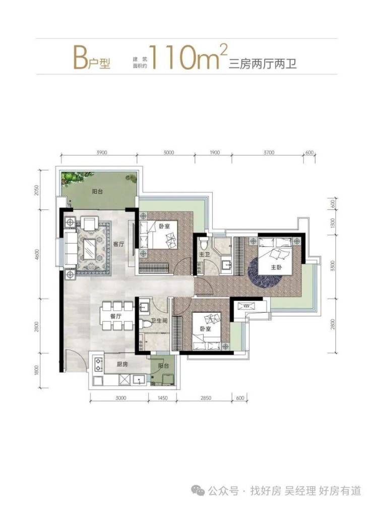 - 布局:竖厅设计,LDKB(客餐厨阳)一体化,客厅开间3.9米,主卧3.3米宽带飘窗,次卧3.1米。