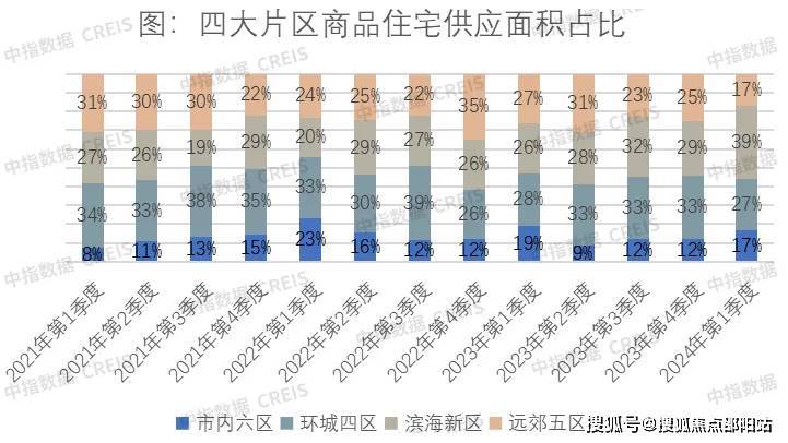 2024年一季度,滨海新区商品住宅成交58.36万㎡,全市占比为34%,同比提高6个百分点。环城四区成交51.55万㎡,全市占比为30%,同比下降1个百分点。远郊五区成交41.34万㎡,全市占比为24%,同比下降3个百分点。市内六区成交22.9万㎡,全市占比为13%,同比下降1个百分点。