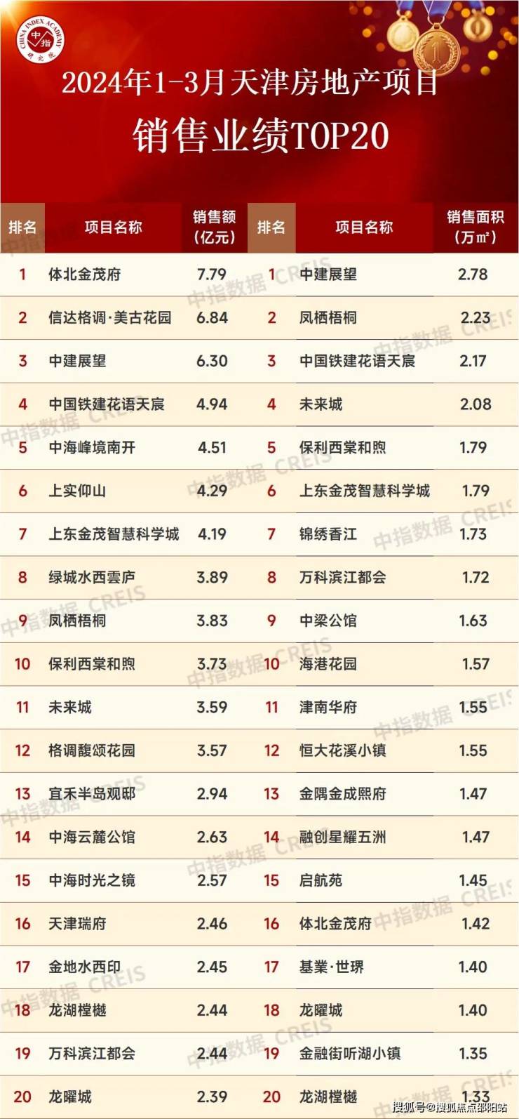 2024年1-3月,天津商品住宅销售金额TOP20项目共成交70.52亿元,入榜门槛为2.39亿元。其中体北金茂府揽金7.79亿元,跃居榜单冠军,信达格调·美古花园6.84亿元位于榜单第二,中建展望以6.30亿元的销售业绩稳居榜单第三位。