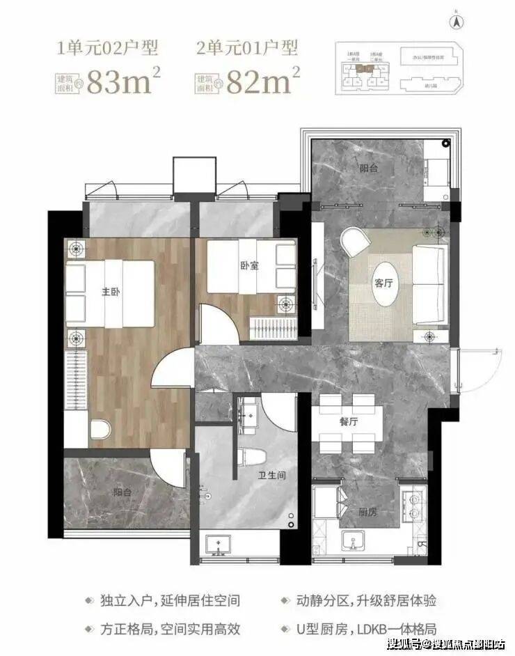 82-83㎡的3房2厅1卫,1栋1单元02户型/1栋2单元01户型,设计的是竖厅南北通透格局,独立入户,客厅3.2米开间,LDKB一体化设计,动静分区,南北双阳台,U型厨房,卫生间干湿分离,阳台正北朝向。