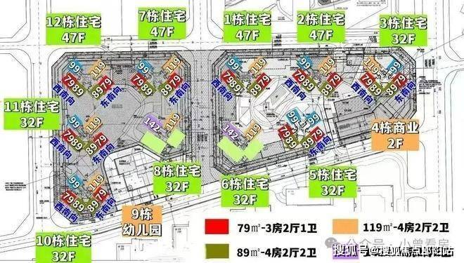 其中东区:占地2.1万㎡,容积率5.28,含住宅、商业、活动室、老年照料中心及配套设施。建筑包括:1栋45层(3梯6户)、2栋44层(3梯6户)、3/5栋32层(2梯6户)、6栋32层(2梯5户)和4栋商业楼2层。东区5栋已全部入市。