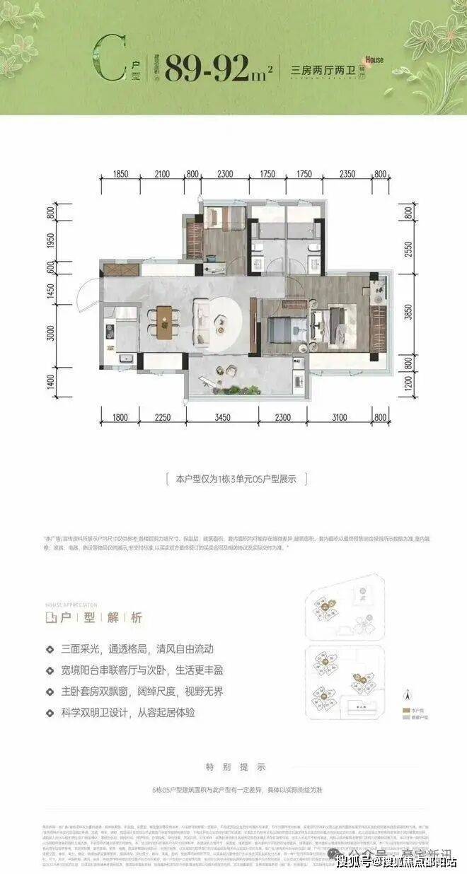 首次推首北地块1栋3单元,约80-92㎡ 3房,共195套,新规使用率高达96%-105%!