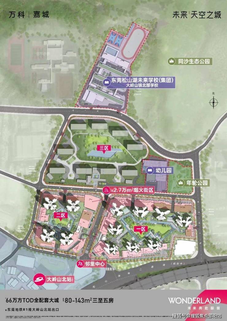 项目位于大岭山北站TOD,规划约66万平的体量,打造一座能代表城市的TOD未来超级生活大城。在项目旁边,是东莞松山湖未来学校教育集团成员之一的 大岭山镇北部学校 ,据悉,该学校为公立小学,由未来天空之城项目配建。