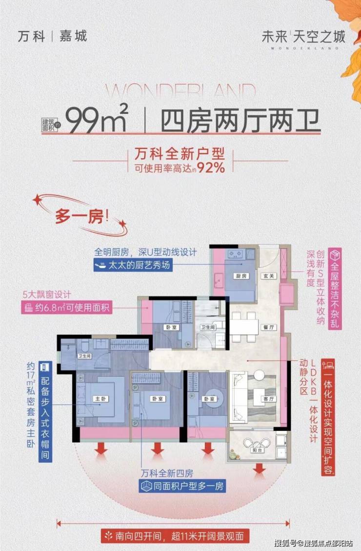 建面约99㎡户型,使用率高达92%,实现四开间朝阳,约17㎡的大主卧,同等面积多一房