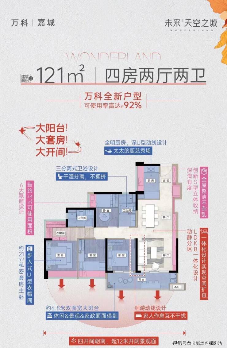 建面约121㎡户型,使用率高达92%,实现四开间朝阳,约6.8㎡双面大阳台,主卧可实现南北对流