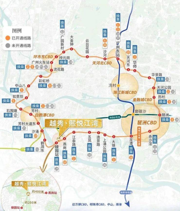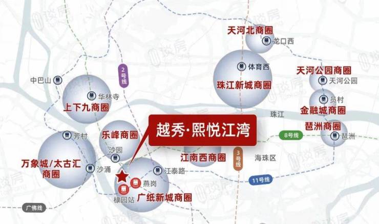 地铁:距离广佛线燕岗站B口约 400 米,广州地铁 11 号线棣园站约 250 米,7 站可达南站,7 站可达琶洲,可快速连接全城,虹吸广佛优质资源
