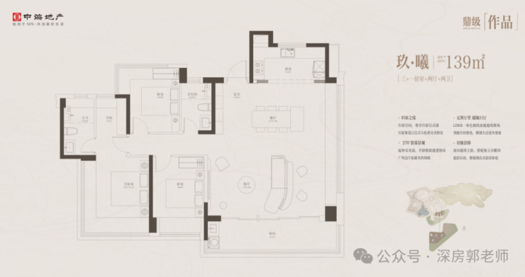 139㎡拥有超大双面采光大方厅,可享西南向山景和东南向大运中心双面景观,户型算是3+1房,可以改造为4房,喜欢全通透大客厅的可选。