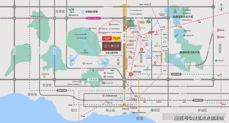 项目西侧紧挨大水坑社区公园;北侧是九龙山智能科技城,华为新基地+美团总部均集结于此;南侧靠近万科九龙山,西侧一大片区域是福城土地整备利益统筹项目;华为