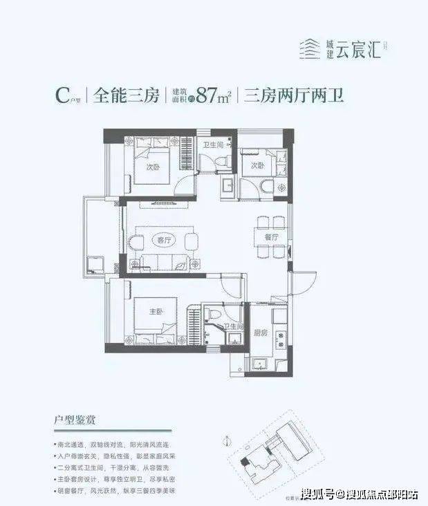 87㎡的3房2厅2卫,设计的双龙抱珠格局,餐客厅一体化,L型厨房,东南朝向。