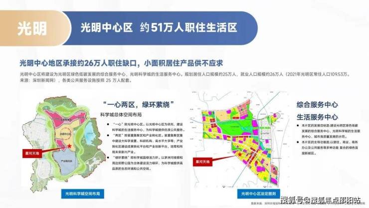 2020年6月9日深圳市规划和自然资源局发布《光明科学城规划刚要》中,规划“一心两区,绿环萦绕”的科学城总体空间布局,以光明中心区为依托,建设科学城的生活服务中心。(资料来源:深圳市政府在线)