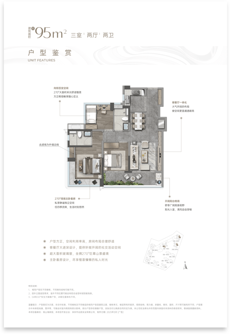 主卧小家化:主卧+衣帽间+独立卫浴+270°转角巨幕飘窗。