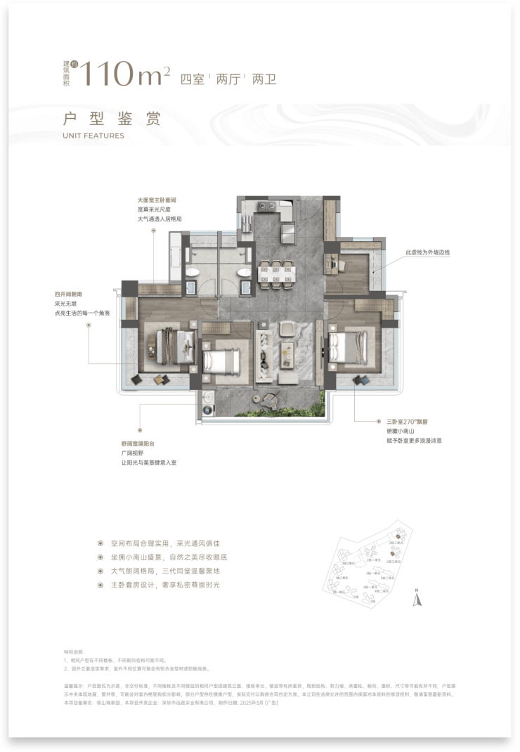 C位央景:3&4#压轴板楼正居园区C位,众星捧月,居中显贵,瞰山揽园,尽揽一线大南山景、央景园林,楼下即观山泳池、水庭院瀑布,环幕视界,风光万千。