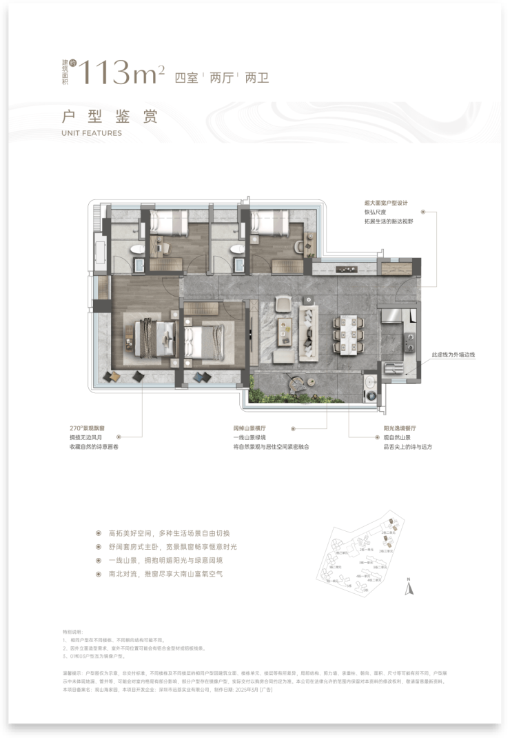 约6.1米的宽景阳台,加上两侧卧室的超大飘窗,全屋形成了约13.2米的超大面宽,格局大气通透,足以将小南山的青翠盛景尽揽于眼界之中。