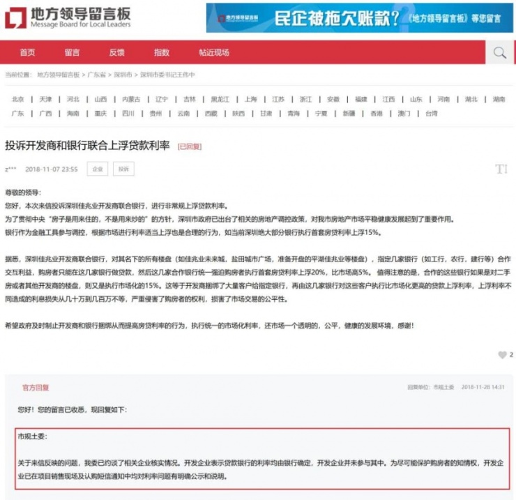 早在11月初,就有业主投诉佳兆业在深圳的项目佳兆业未来城、盐田城市广场、平湖佳兆业广场等楼盘合作的几家银行首套房贷利率较基准利率上浮20%,比市场高5%。11月28日,深圳市规土委就在人民网地方领导留言板上回应称,已约谈相关企业核实情况,开发企业表示贷款银行的利率均由银行确定,并未参与其中。