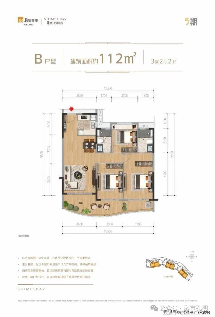 约112㎡三室两厅两卫○ 套房式主卧带景观阳台,私享浪漫旅居○ 客餐厅连接波浪式景观阳台,视野开阔○ 次卧享观景阳台/飘窗,采光通透○ 舒适三居配置独立厨房,烹制美好食光