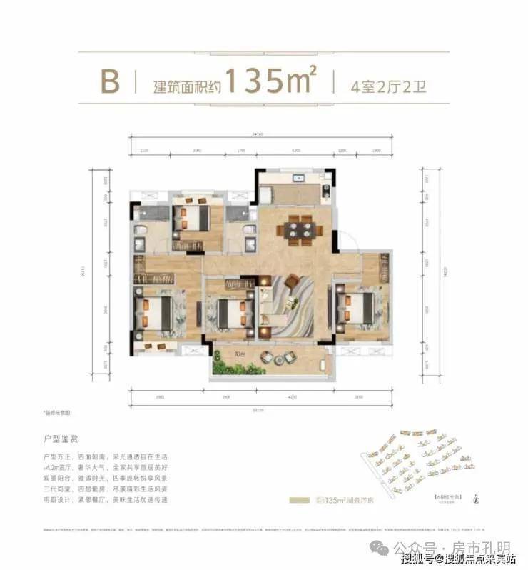 建面约135㎡四房两厅两卫○户型方正,四面朝南,采光充足自在生活○约4.2m宽厅,奢华大气,全家共享旅居美好○观景阳台,雅适时光,四季流转悦享风景○三代同堂,四居套房,尽展精彩生活风姿○明厨设计,紧邻餐厅,美味生活加速传递