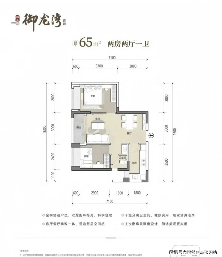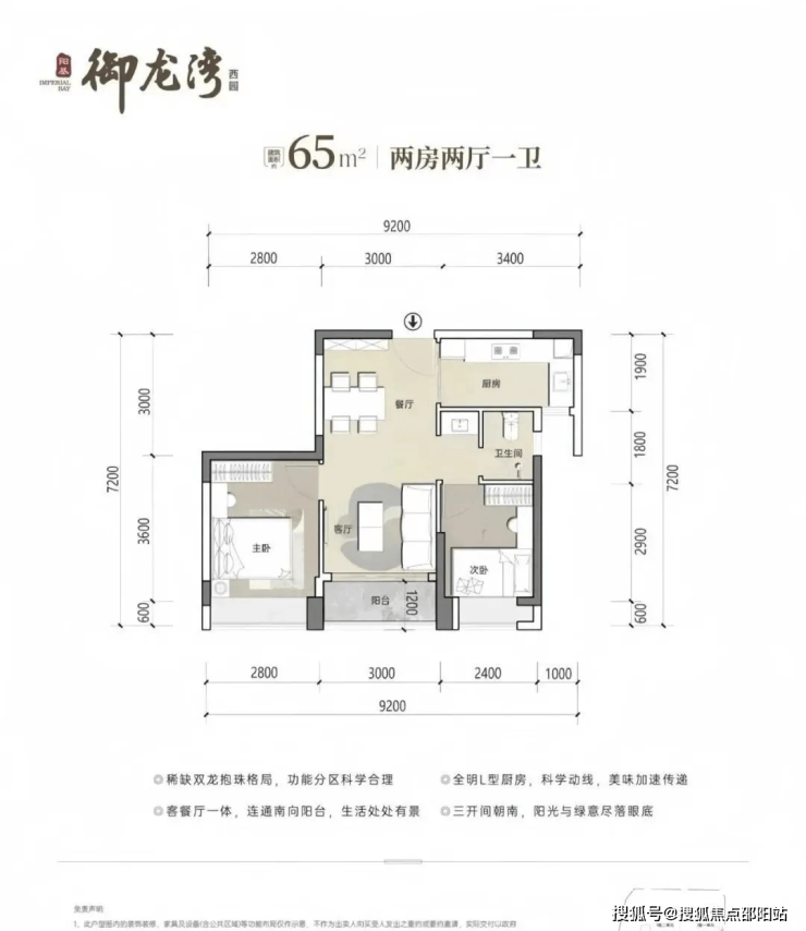 65㎡2房1卫,分布在1栋3/4单元04/05户型,设计的是竖厅稀缺的双龙抱珠格局,客厅开间3米,三开间朝南,L型厨房,卫生间分离设计,得房率约73.26%(不含赠送),西南朝向,加上赠送得房率约80%