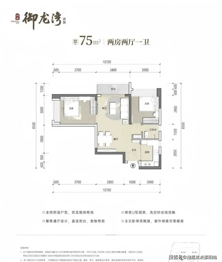 75㎡2房1卫,分布在1栋3/4单元03/06户型,设计的是竖厅稀缺的双龙抱珠格局,客厅开间3.4米,U型厨房,卫生间三段式分离设计,得房率约73.26%(不含赠送),东南或西北朝向,加上赠送得房率约80%