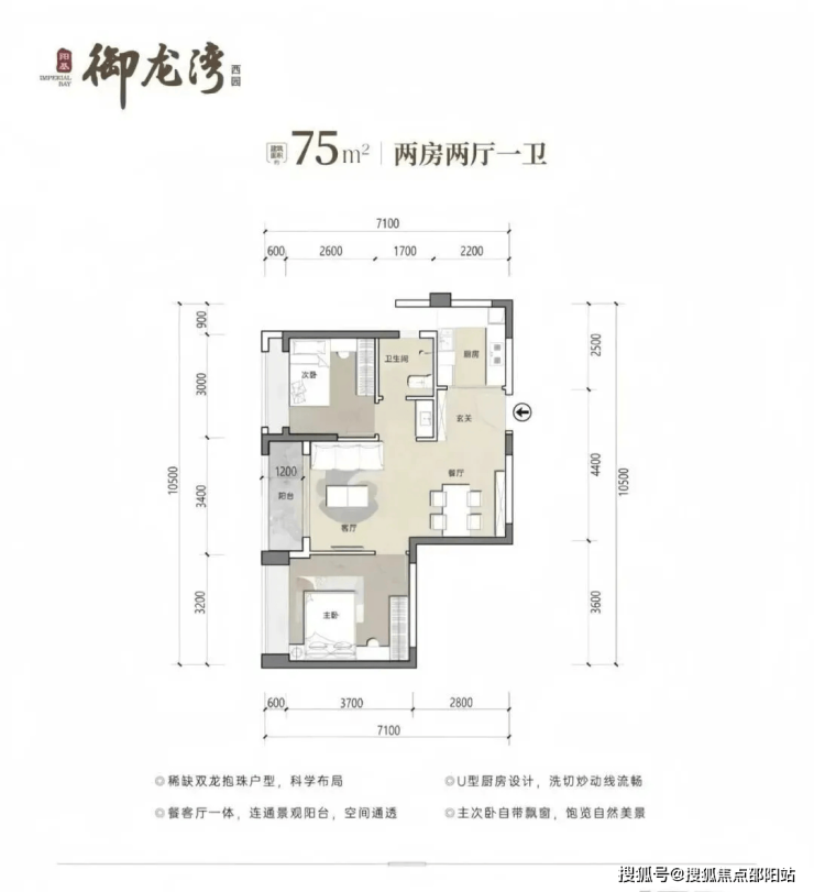 75㎡2房1卫,分布在1栋3/4单元01/08户型,设计的是竖厅稀缺的双龙抱珠格局,客厅开间3.4米,U型厨房,卫生间三段式分离设计,得房率约73.26%(不含赠送),东南或西北朝向,加上赠送得房率约80%