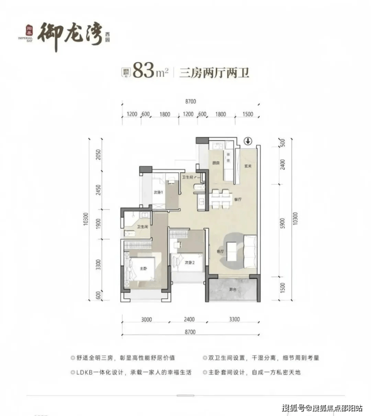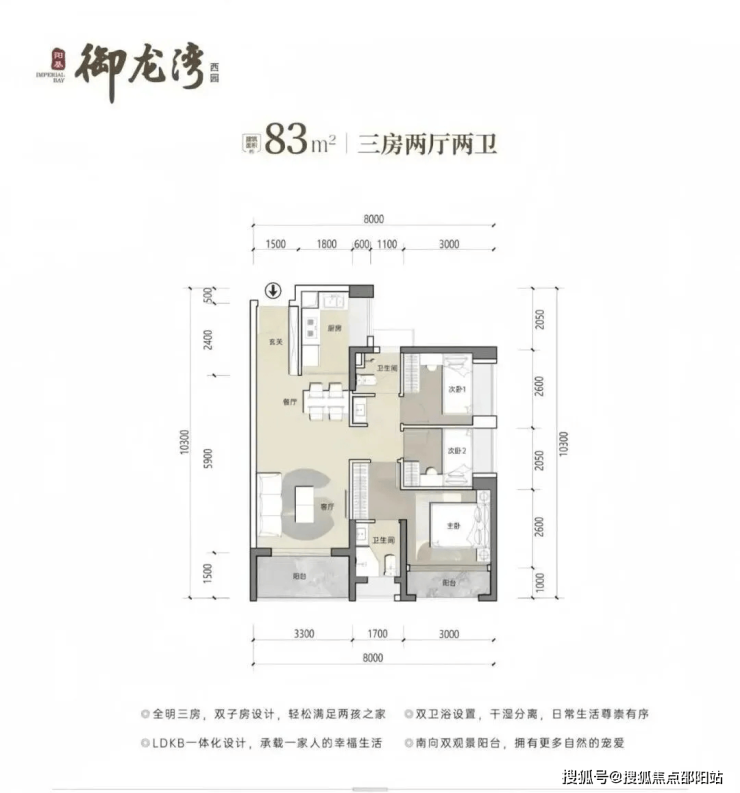 83㎡3房2卫,分布在2栋2单元03/04户型,设计的是竖厅格局,客厅开间3.3米,LDKB一体化设计,三开间朝南,U型厨房,公卫三段式分离设计,得房率约79.25%(不含赠送),东南或西南朝向,加上赠送得房率约89%