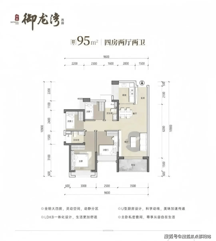 95㎡4房2卫,分布在2栋1单元/3栋03/04户型,设计的是经典竖厅格局,客厅开间3.5米,LDKB一体化设计,三开间朝南,U型厨房,卫生间干湿分离设计,得房率约79.25%(不含赠送),东南或西南朝向,加上赠送得房率约88%
