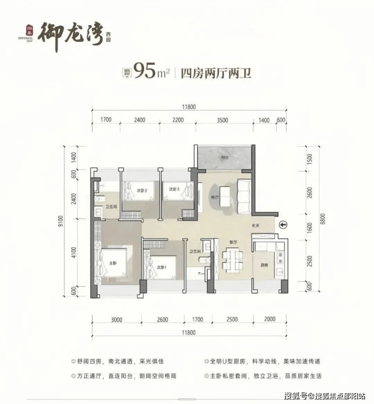 95㎡4房2卫,分布在2栋1单元06户型,设计的是竖厅南北通透格局,客厅开间3.5米,五开间朝南,U型厨房,公卫三段式分离设计,得房率约79.25%(不含赠送),阳台主朝东北向,加上赠送得房率约93%