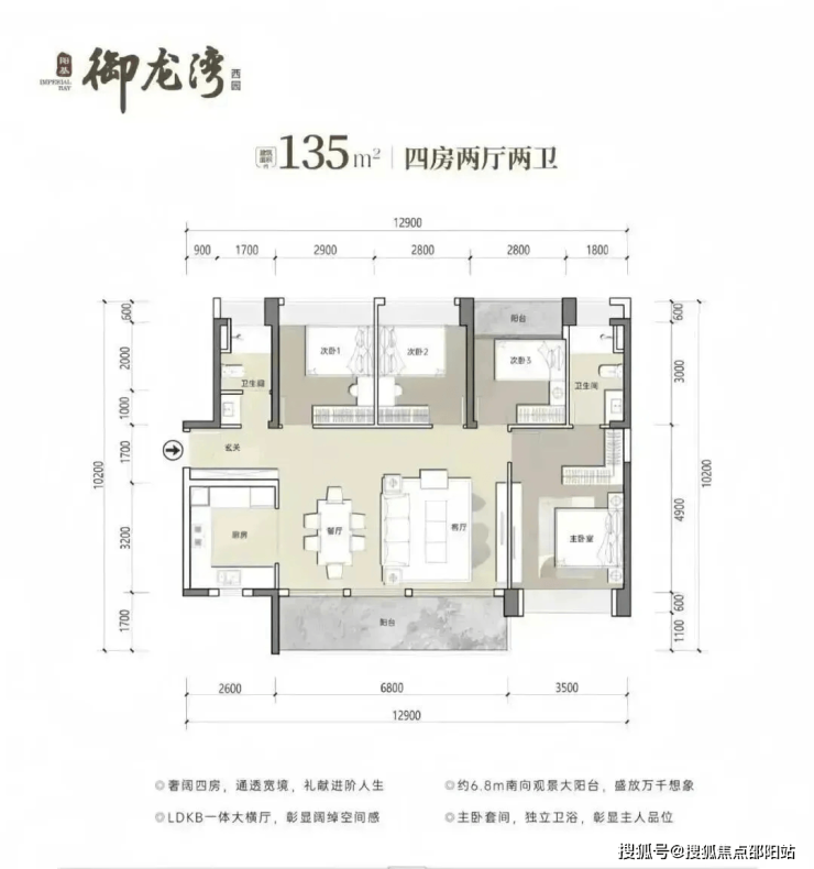 135㎡4房2卫,设计的是横厅南北通透格局,客餐厅开间6.8米,LDKB一体化设计,四开间朝南,U型厨房,公卫三段式分离设计,得房率约79.25%(不含赠送),阳台主朝东南或西南向,加上赠送得房率约90%